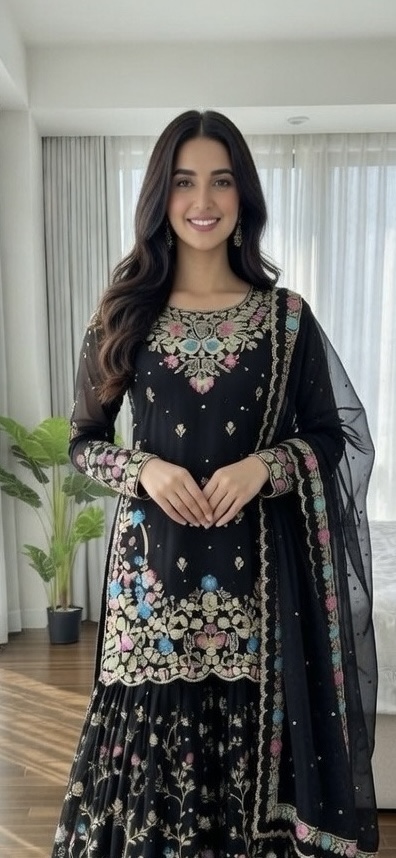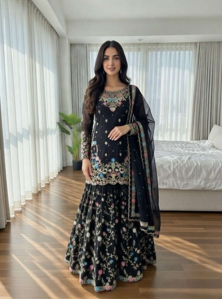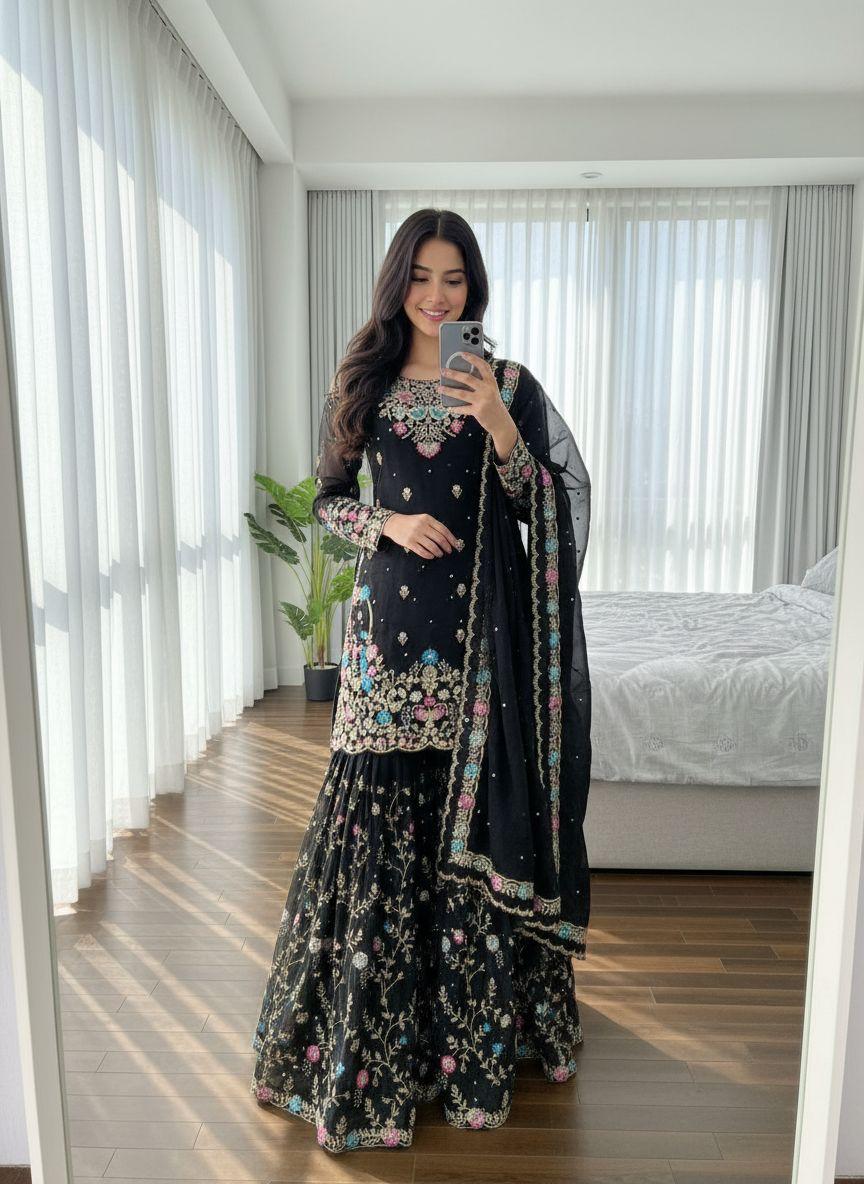 black hand embroidered sharara suitBlack Hand-Embroidered Sharara Suit