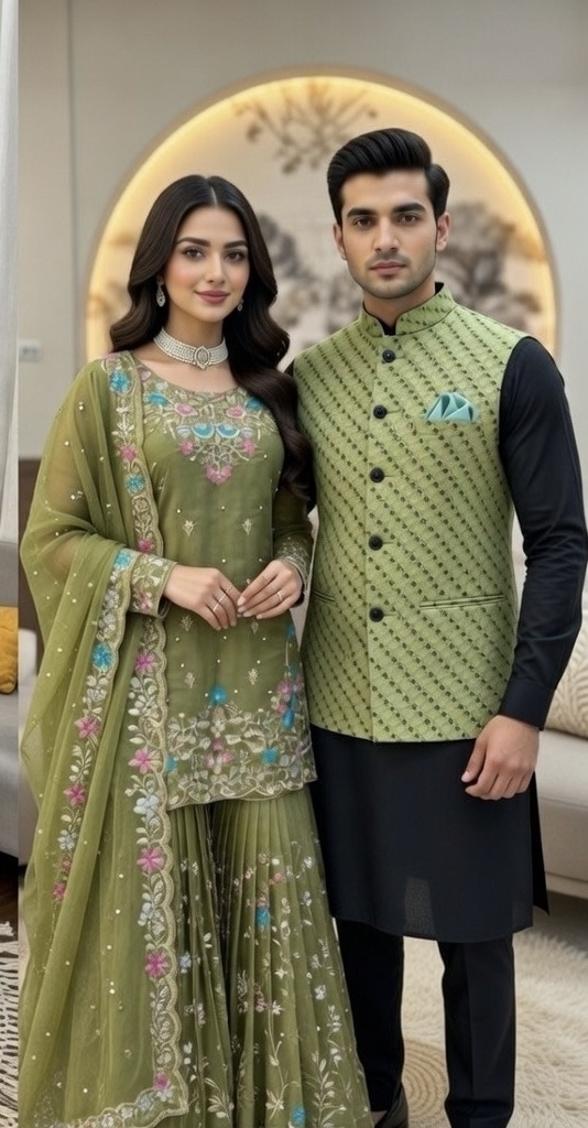 This Green three-piece ensemble features a premium silk-blend kurta adorned with vibrant multi-colored floral embroidery and delicate hand-beaded accents.
