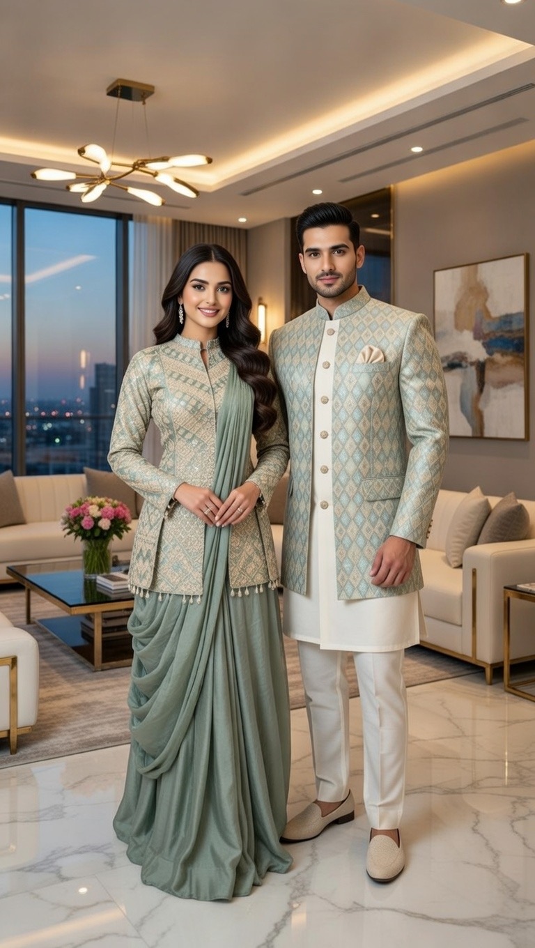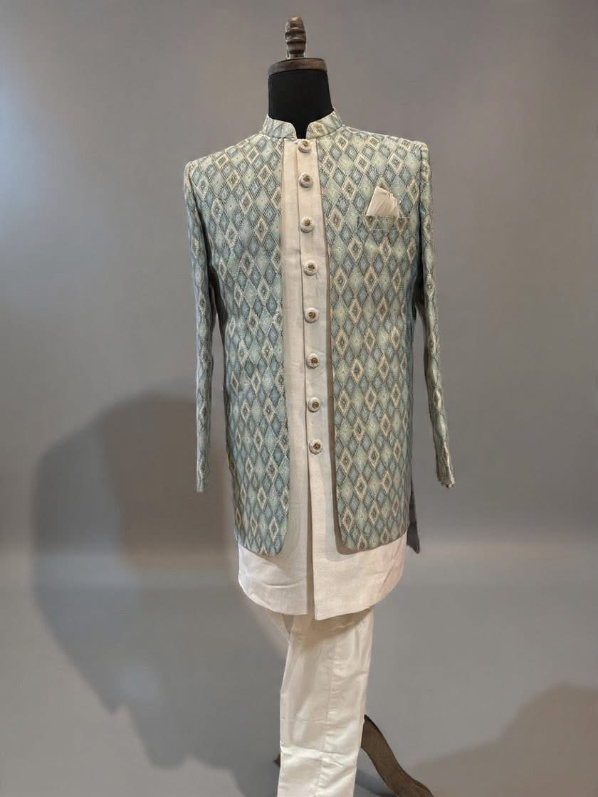 Stylish men’s Indo-Western suit. Has a long outer jacket with a textured pattern. Inner kurta attached and matching pants in Sage Green color. Great for weddings, parties, or formal events.