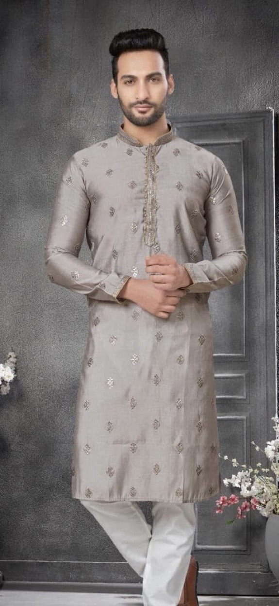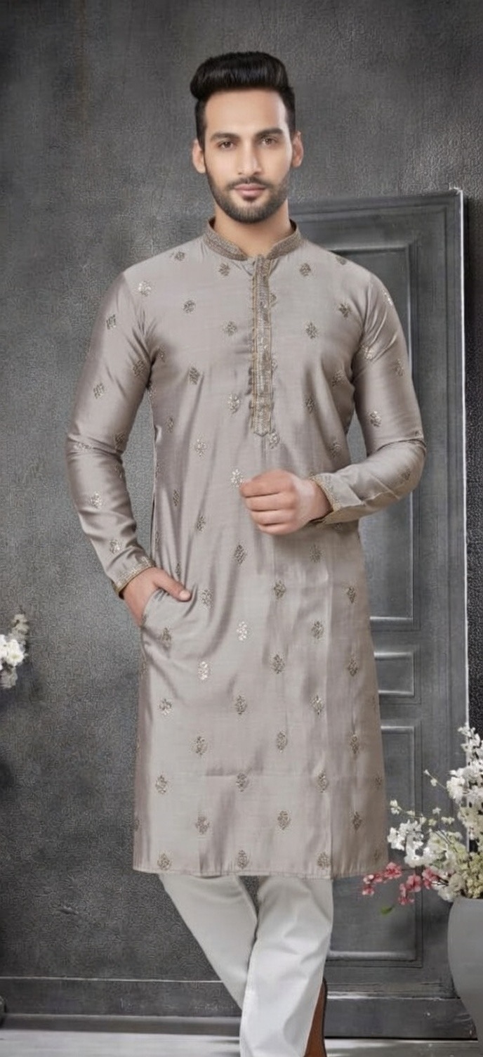 Introducing our premium grey ethnic wear collection! Made with high-quality rayon silk fabric, each piece features intricate embroidery work and thread work on both sides. With the added convenience of both side pockets and hidden button patti, these pieces are both stylish and practical. Complete your look with the included Raymond silk brown pyjama. Elevate your wardrobe with our premium collection today.