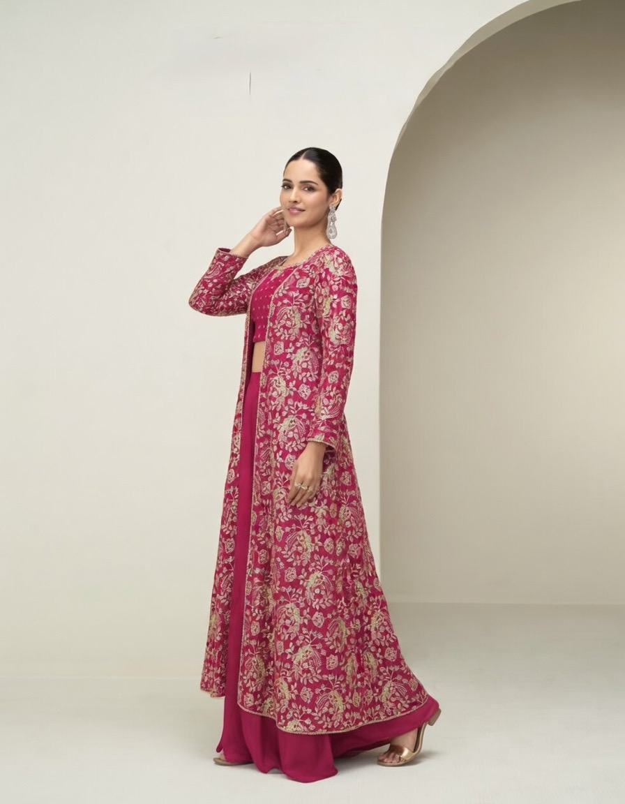Vibrant magenta ethnic wear 4pc set. Crop top has gold embroidery work. Wide-leg palazzo pants are plain and high waist. Long open jacket has intricate gold embroidery. Great for special occasions. Comes with solid dupatta!