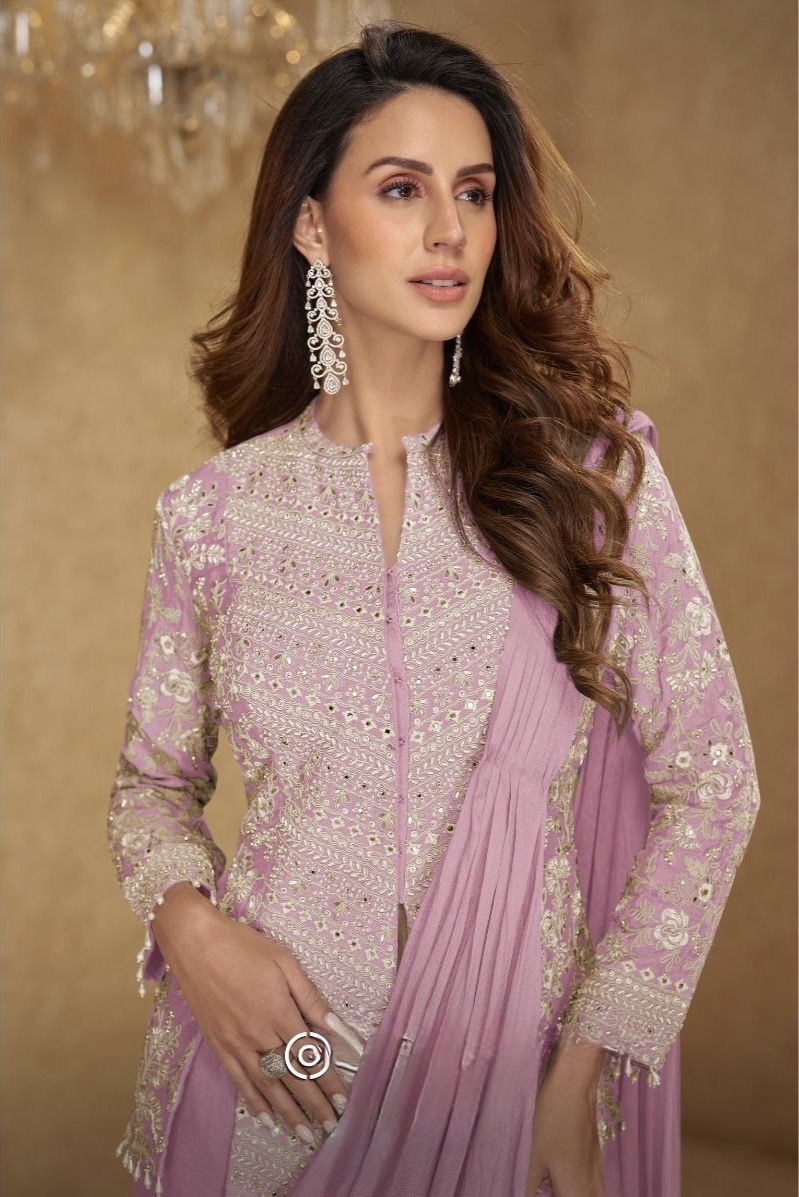 This vibrant pink ethnic wear saree is made of silk and pre-draped, making it ready to wear in a matter of less than a minute. The blouse is a blazer style has intricate gold embroidery and pearl work. It’s perfect for special occasions.