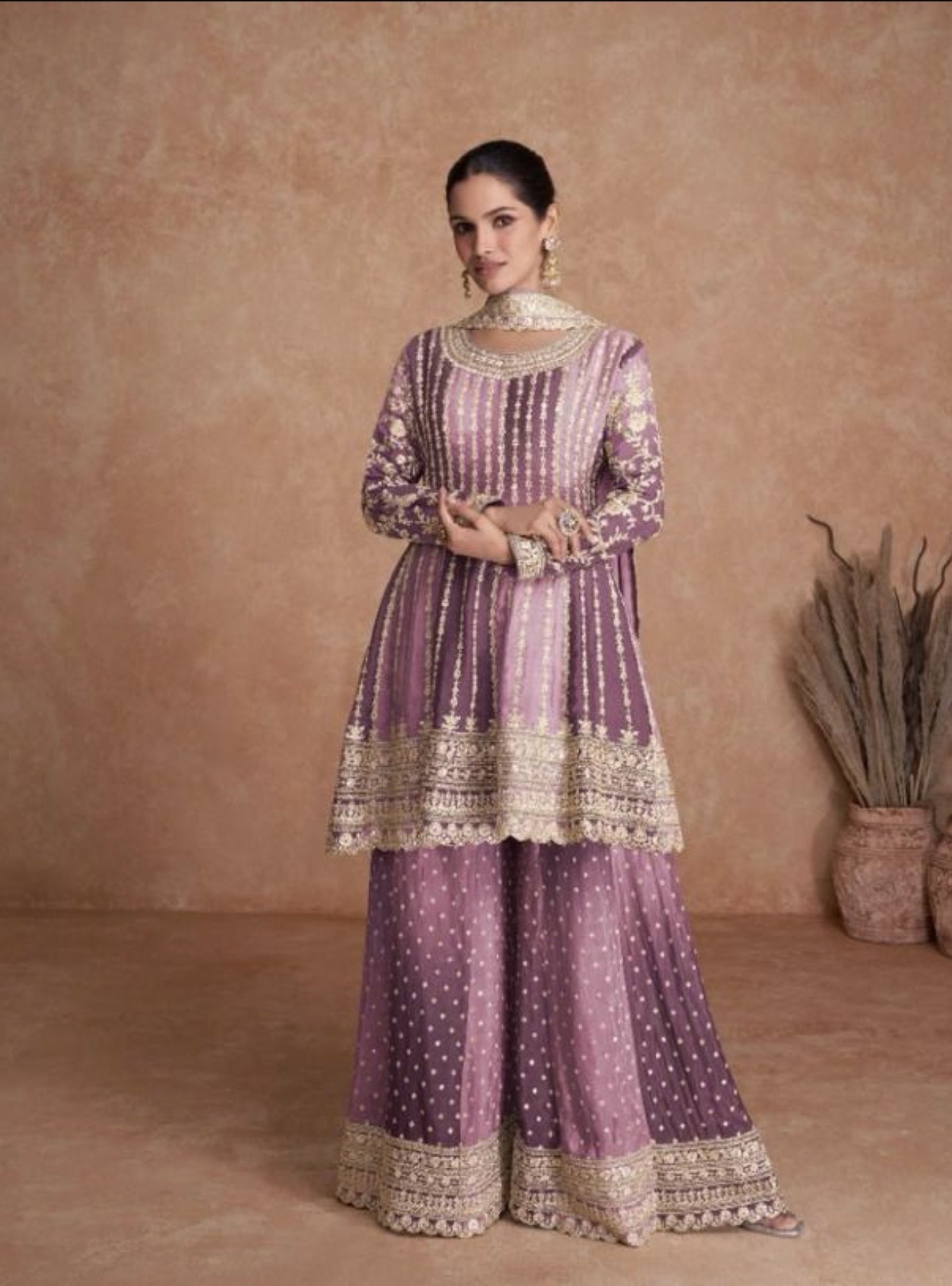 Add a touch of quirk to your wardrobe with our Embroidered silk Kameez. This playful piece features stunning purple color and intricate embroidery all over, with a unique palazzo bottom. Made from pure silk with fully inner, it offers both style and comfort. Grab yours now! Comes with matching silk dupatta and silk Sharara.