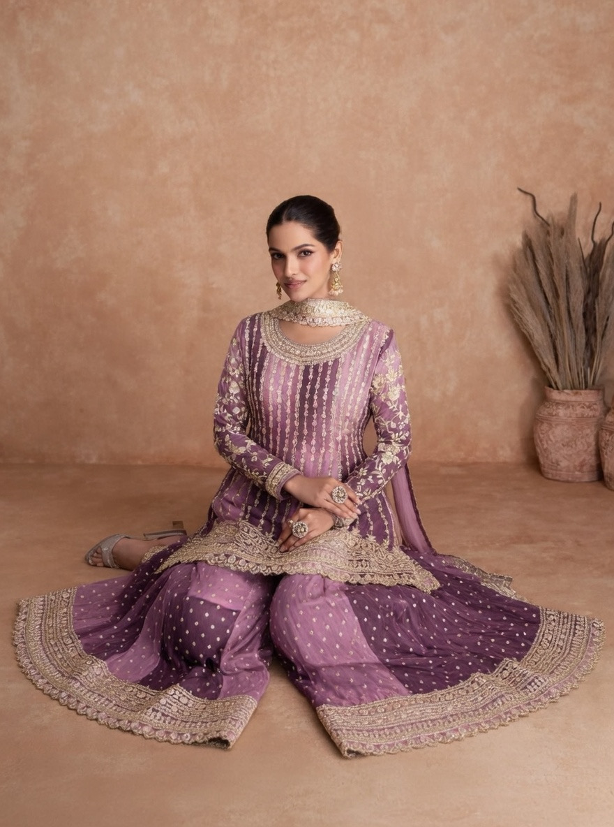 Silk Embroidered Purple Sharara Suit
