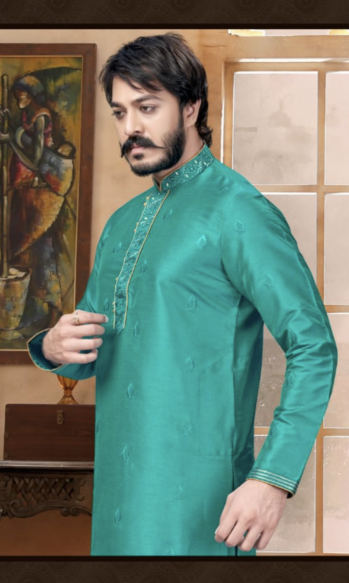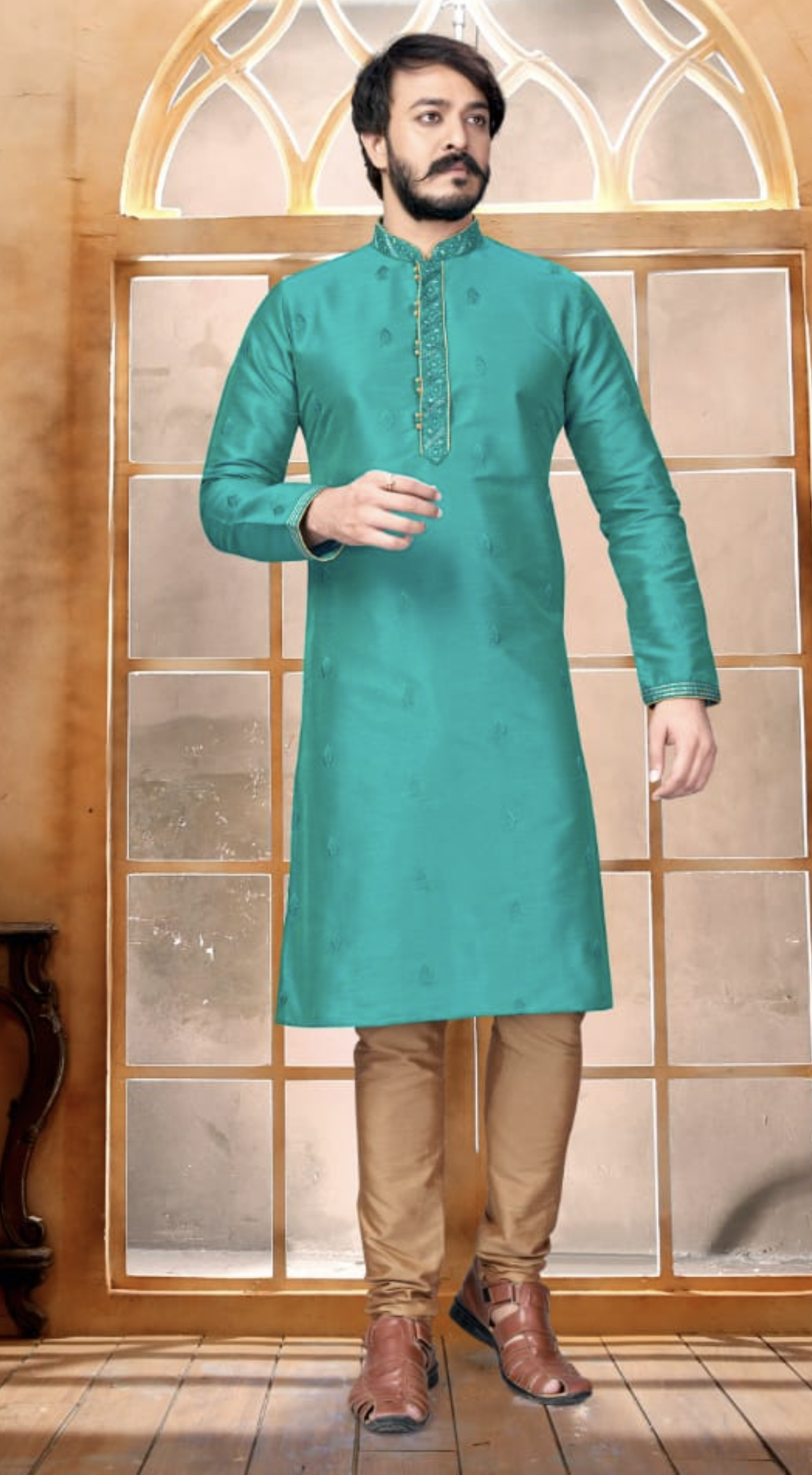 Introducing our premium teal blue ethnic wear collection! Made with high-quality duping silk fabric, each piece features intricate embroidery work and thread work on both sides. With the added convenience of both side pockets and hidden button patti, these pieces are both stylish and practical. Complete your look with the included Raymond silk brown pyjama. Elevate your wardrobe with our premium collection today.