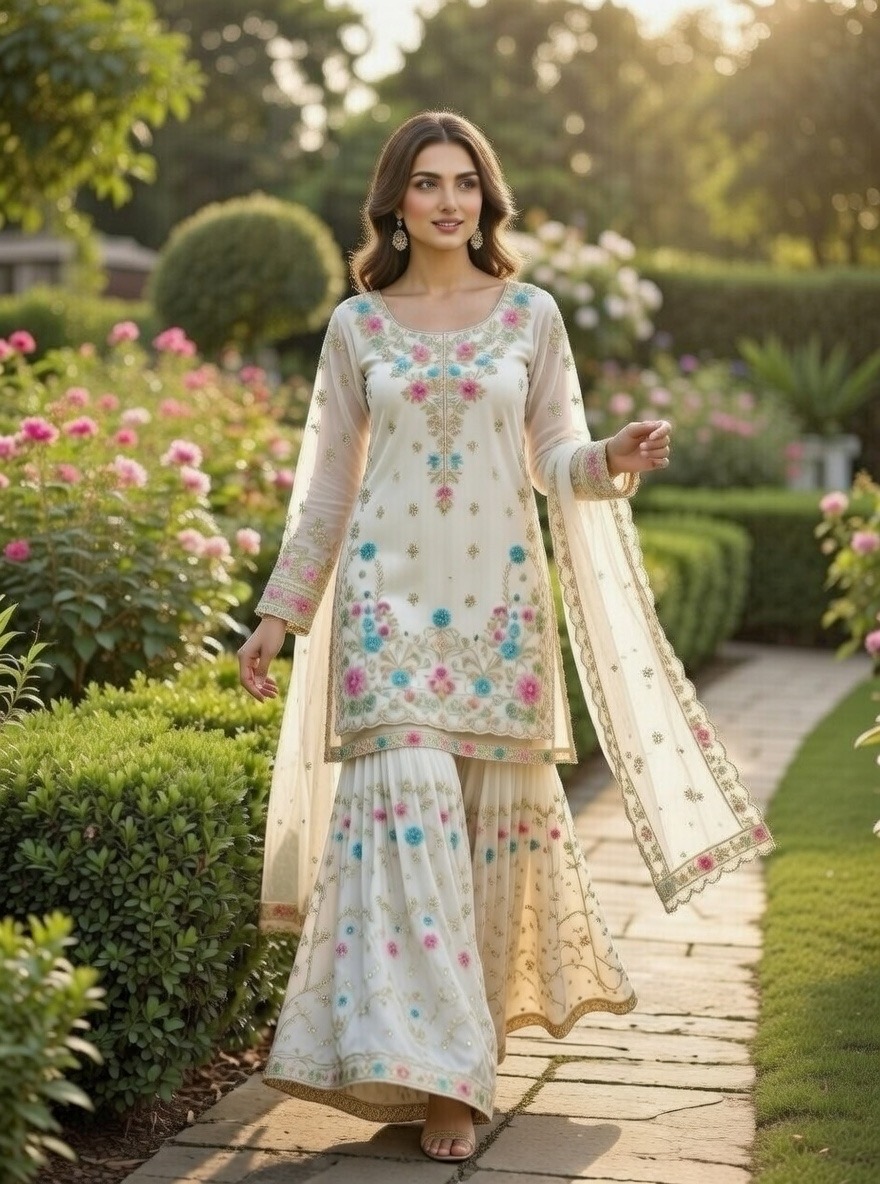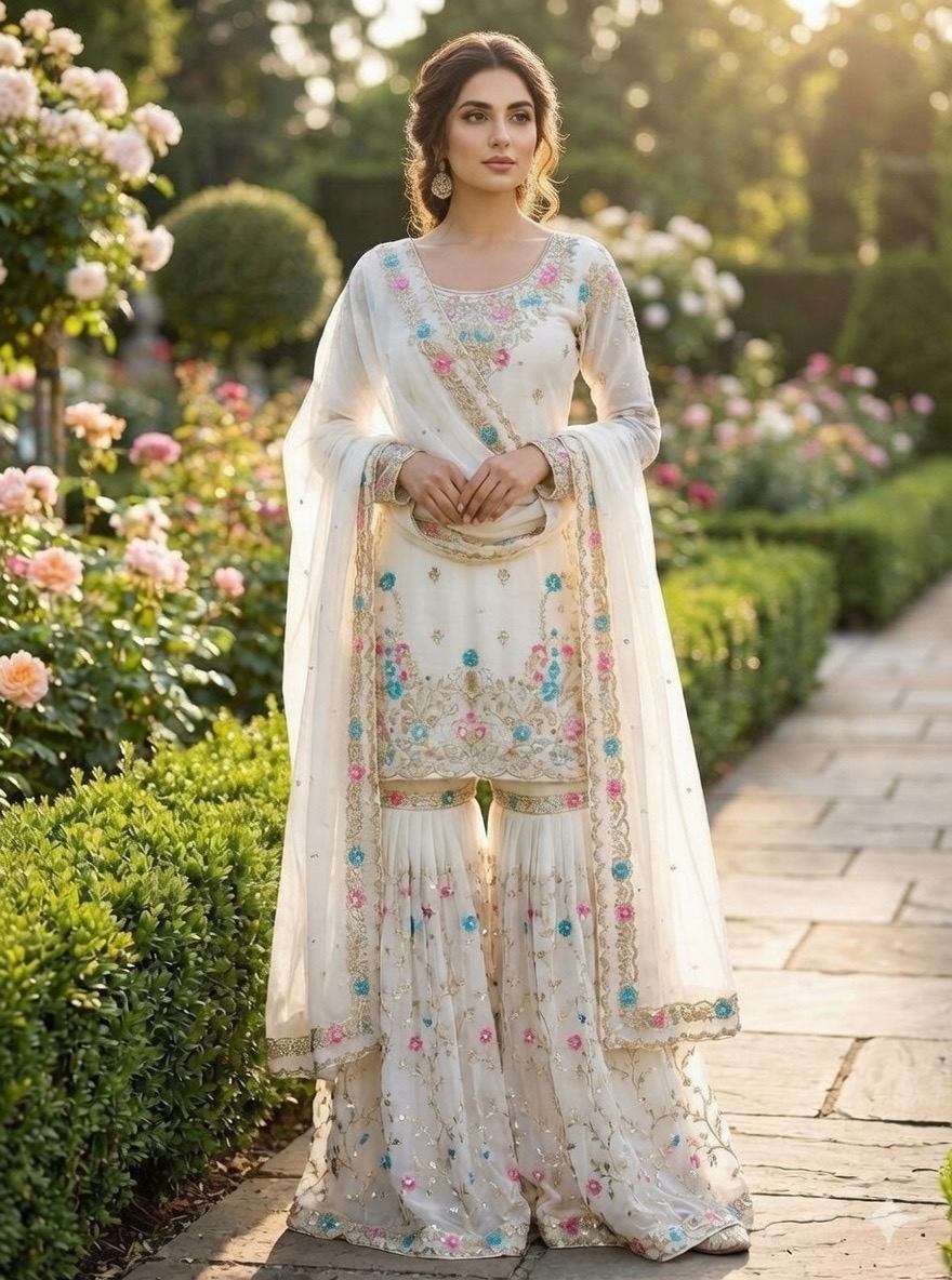 This white three-piece ensemble features a premium silk-blend kurta adorned with vibrant multi-colored floral embroidery and delicate hand-beaded accents.