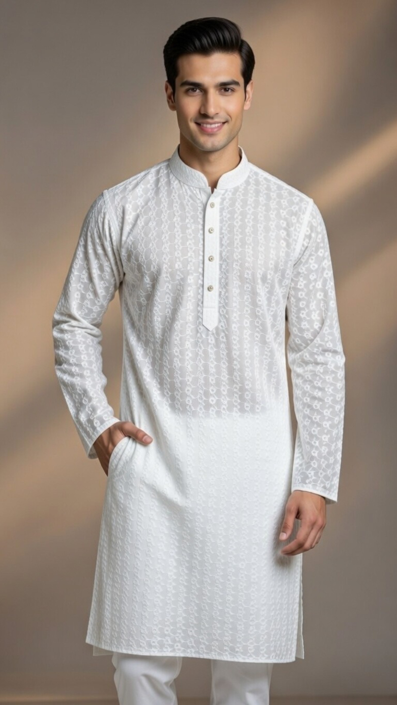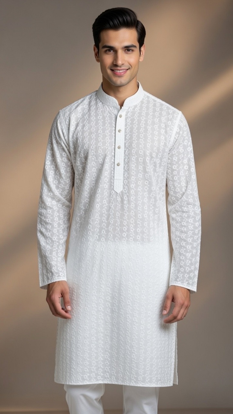 Introducing our premium white ethnic wear collection! Made with high-quality soft rayon embroidery and chikankari work, each piece features intricate embroidery work and thread work on both sides. With the added convenience of both side pockets and hidden button patti, these pieces are both stylish and practical. Complete your look with the included Raymond silk brown pyjama. Elevate your wardrobe with our premium collection today.